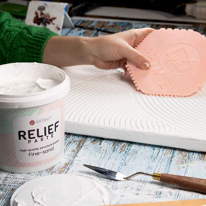 Predstavljamo 3D reljefnu pastu za modeliranje ARTMIE, savršen medij za kreiranje neverovatnih 3D reljefnih šara na različitim površinama. Ovaj trend je očarao mnoge umetnike zahvaljujući beskrajnim kreativnim mogućnostima koje ova pasta krije. Bez obzira da li kreirate DIY zidne umetničke radove ili minimalističku sliku na platnu, ova pasta će vam poslužiti. Fina pasta ARTMIE savršeno se uklapa sa platnom. Jednostavno je razmažite i brzo se suši bez gubitka volumena. Rad sa nanešenom 3D strukturom može se dodatno ukrasiti bojama, metalik listićima, posuti šljokicama, velur prahom, kombinovati sa drugim materijalima. Možete je koristiti na drvetu, kartonu, platnu, keramici, pločicama i staklu. Ako vam se sviđa RAW prirodan izgled same paste, možete ostaviti reljef na platnu bez bojenja. Pasta je vodootporna nakon sušenja, ali radi lakšeg održavanja može se tretirati lakom u spreju.