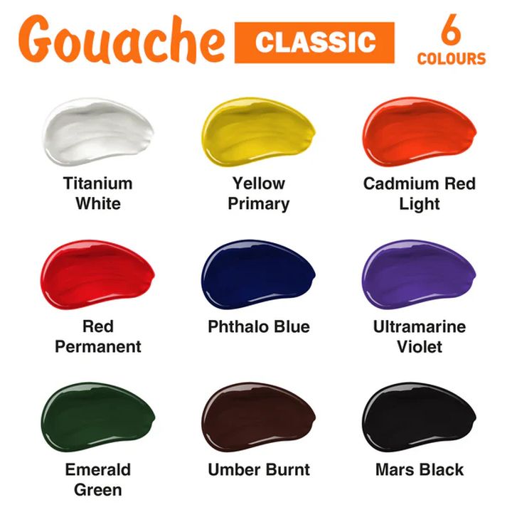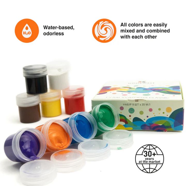 Komplet klasičnih gvaš boja kompanije Kompozit nudi pakovanje od 9 kvalitetnih boja, svaka zapremine 20 ml. Ove visoko pigmentisane boje su dizajnirane da obezbede savršenu pokrivenost i stvore mat površinu sa efektom baršunaste teksture nakon sušenja. Prednost ovih boja je njihova fina struktura i lako mešanje nijansi. Klasične gvaš boje su idealne za širok spektar umetničkih primena, uključujući slikarstvo, grafiku, dekorativnu i upotrebnu umetnost. Zahvaljujući komponenti rastvorljivoj u vodi, lako se nanose i čiste. Set uključuje posebno odabranu paletu boja koje se lako kombinuju i stvaraju nove nijanse, omogućavajući umetnicima beskrajne mogućnosti da eksperimentišu sa bojama. Svaka od boja odlikuje se homogenom konzistencijom i zahvaljujući svom sigurnom sastavu pogodne su i za dečije projekte. Set gvaš boja je praktično upakovan, što olakšava njegovo skladištenje i transport. Parametri proizvoda: - Klasični set gvaš boja kompanije Kompozit - Zapremina 9 k 20 ml - Rastvorljiv u vodi - Bez mirisa - Homogena konzistencija, sa visokom pigmentacijom - Pogodan za slikanje, grafiku, i dekorativna umetnost- Visoka pokrivna sposobnost- Mat somotna površina nakon sušenja- Bezbedno za decu, zadovoljava ekološke standarde