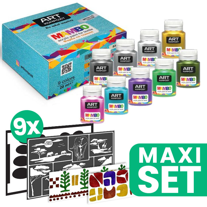 Za sve kreativne entuzijaste, profesionalne umetnike, studente umetnosti ili povremene stvaraoce, pripremili smo posebne kombinovane setove koji sadrže sve što vam je potrebno da u potpunosti razvijete svoj umetnički talenat. Naši povoljni setovi pažljivo su sastavljeni od naših najpopularnijih i najkvalitetnijih proizvoda. Bilo da ste zainteresovani za slikanje na platnu, tehniku akvarela, crtanje ili druge umetničke tehnike. U našoj ponudi nalaze se raznovrsni setovi , koji su idealni za poklon vašim najmilijima ili kao kompletan početni set za sebe. Sa ovim setovima možete biti sigurni da koristite proizvode visokog kvaliteta koji vam omogućavaju da postignete profesionalne rezultate. Izaberite iz našeg asortimana povoljnih kompleta i uronite u svet kreativnosti sa našim dokazanim i popularnim proizvodima. Budite inspirisani i stvarajte dela na koja ćete biti ponosni! U ovom setu ćete naći MAMBO metalik boje za tekstil i devet različitih šablona za slikanje u ETNO stilu.
