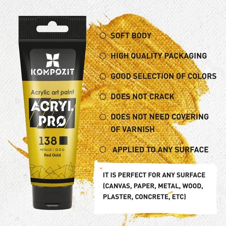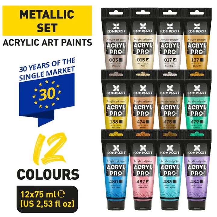 ACRIL PRO METALLIC set akrilnih boja je idealno rešenje za sve umetnike koji traže visokokvalitetne boje sa odličnom pokrivnošću. Ove metalik akrilne boje na bazi vode su bez mirisa i, kada se osuše, stvaraju čvrst, elastičan film koji ne puca tokom vremena i otporan je na uticaj vode. Zahvaljujući svojoj fino dispergovanoj strukturi, pogodni su i za airbrushing i FLUID ART tehniku. Boje u setu se lako mešaju i kombinuju, omogućavajući širok spektar nijansi. Pogodni su za unutrašnje i spoljašnje radove i bezbedni za dečije igračke, što potvrđuju i protokoli ispitivanja. Prilikom nanošenja debelog sloja boje, ne pucaju, osiguravajući dugoročnu trajnost vaših radova. Set sadrži 12 boja koje su napravljene po posebnim recepturama sa visokokvalitetnim pigmentima i aditivima, koji obezbeđuju da boje ne blede i ne menjaju boju tokom vremena. ACRIL PRO METALLIC akrilne boje su pogodne za nanošenje na platnu, drvetu, kartonu, keramici, pločicama, metalnim i mineralnim površinama sa prajmerom. Idealni su za profesionalnu upotrebu kao i za početnike. Pre upotrebe boje, dobro je promešajte i po potrebi razblažite vodom. Nanesite na bilo koji pogodan način i kreirajte željeni uzorak pomoću četke ili lopatice. Vreme sušenja je 1-2 sata u zavisnosti od debljine sloja i uslova. Nakon 1 dana možete pokriti površinu ACRIL PRO ART kompozitnim akrilnim lakom za dodatnu zaštitu. Upotreba od strane dece je moguća samo pod nadzorom odrasle osobe. Očistite mokri radni alat od ostataka boje i temeljno isperite vodom. ACRIL PRO METALLIC set akrilnih boja je vaš pouzdan partner za stvaranje neverovatnih umetničkih dela.