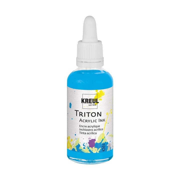 Triton akrilno mastilo nemačkog brenda KREUL je visoko pigmentisana akrilna boja pogodna za platno i papir. Napravite tačke, efekte akvarela ili gradijente boja. Nema ograničenja za fantaziju i kombinacije. Boje se suše do svilenkaste mat površine, postojane su na svetlost i napravljene su na bazi vode. Preporučujemo direktno nanošenje pipetom, četkicom, četkicom sa rezervoarom za vodu, perom ili slikarskim valjkom. Boje je potrebno dobro promućkati pre upotrebe, ponekad je potrebno dosta vremena da se pigmenti spoje, a potrebno ih je izmešati štapićem!