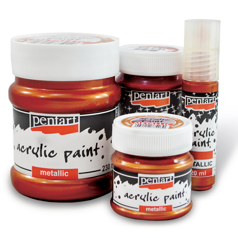 Metalik akrilna boja marke Pentart se karakteriše odličnom pokrivnošću, brzo se suši i nakon sušenja je vodootporna. Idealne su za slikanje na različitim tipovima površina. Napravljene su na vodenoj bazi i mogu se razređivati i mešati sa vodom. Umetnicima daje širok spektar živopisnih i intenzivnih nijansi boja. Sadrže veliku količinu metalik pigmenata, koji površini daju predivan sjajan efekat. Ovo su univerzalne umetničke boje visokog kvaliteta. Koriste se ne samo za umetničko slikanje, već i za dekorisanje predmeta. Omiljene su profesionalnim slikarima, amaterima i hobby kreativcima.